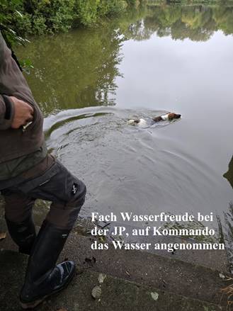 Hierzu wurde wieder mit den Teilnehmern der JP gestartet. Zwei der drei Teilnehmer haben den Weiher gleich mit Freude angenommen. Für die Absolventen der Junghundprüfung, war nach diesem Abschnitt, die Prüfung bereits abgeschlossen, da alle Teilnehmer bereits eine erfolgreiche Bauprüfung nachweisen konnte. Das Prüfungsfach Baueignung musste somit nicht zusätzlich absolviert werden und wird gemäß der PO mit der höchsten Punktzahl bewertet.